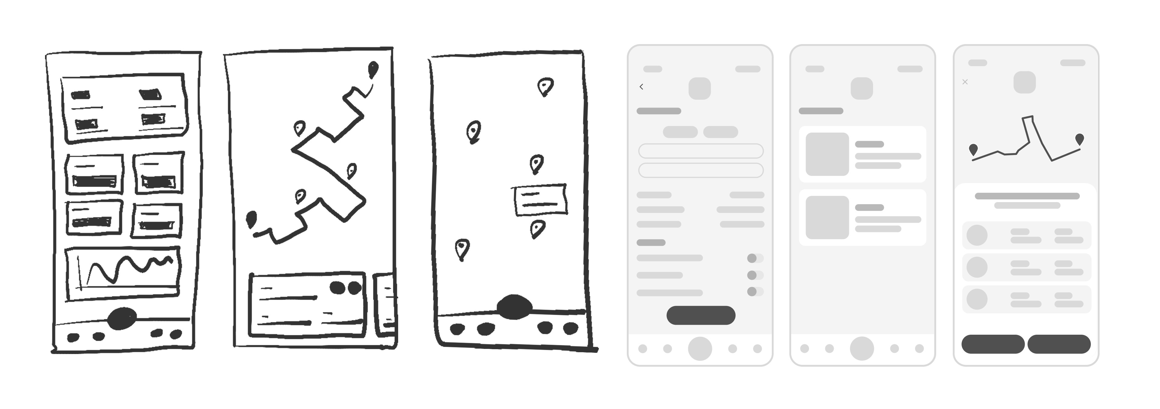 From there, the application structure and the main navigation flows were defined. Low- and medium-fidelity wireframes and prototypes were developed to test the organization of information and the main interactions before the visual design phase.